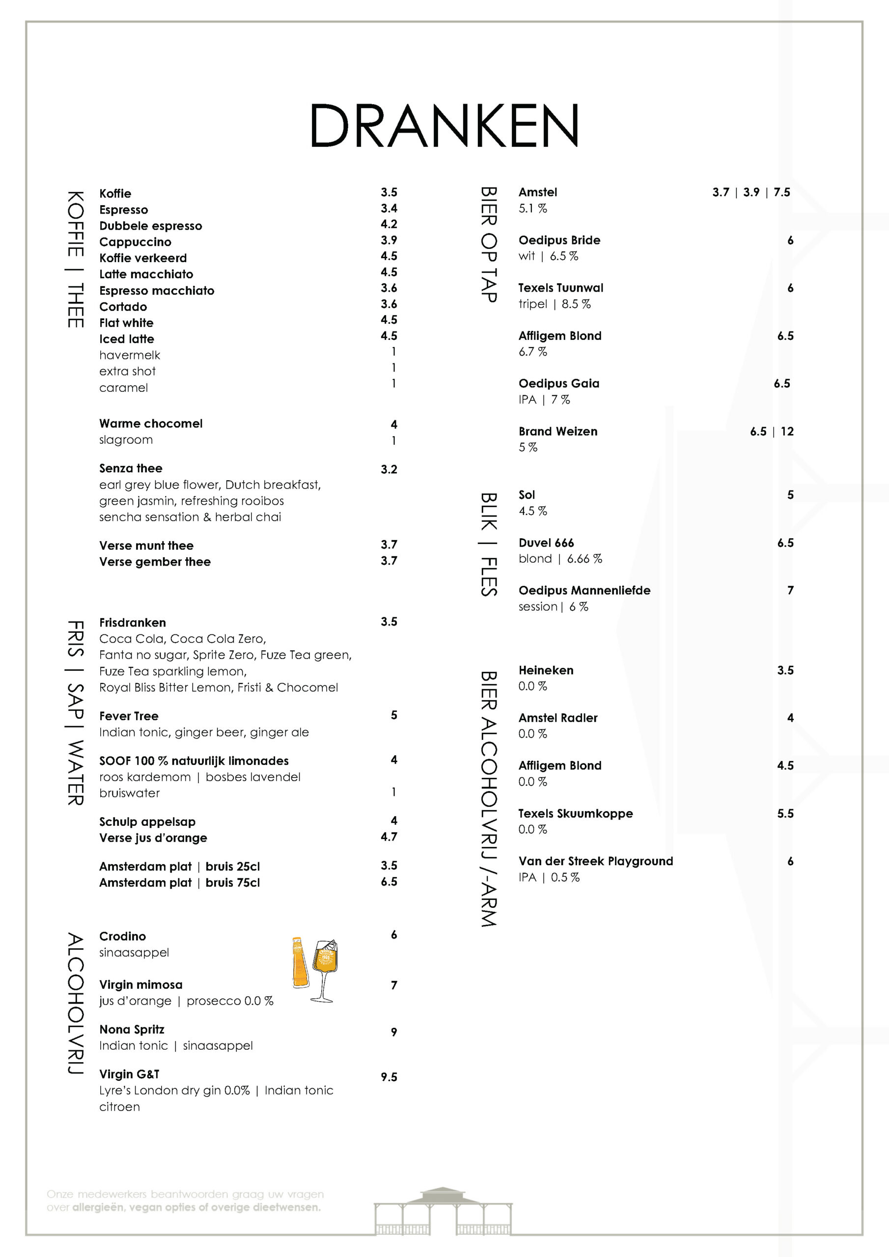 Ook onze drankenkaart biedt een veelvoud aan heerlijke dranken, waardoor er voor iedere liefhebber wat lekkers te vinden is -ongeacht welke aangelegenheid of gerecht. Liever geen alcohol? Geen probleem, ons assortiment bevat meer dan genoeg light -en virgin-versies en andere smakelijke alcoholvrije / -arme opties!